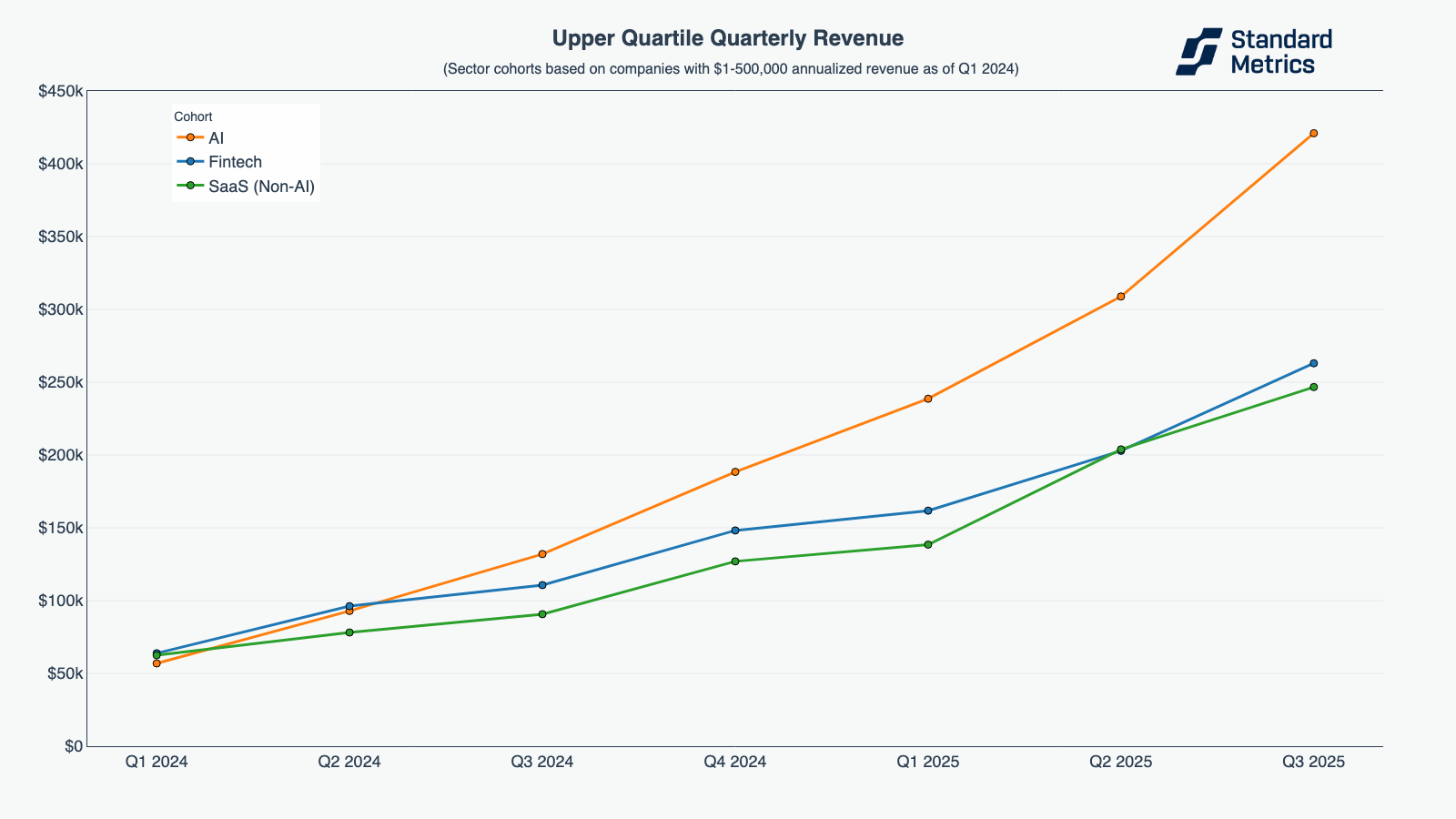 Tracking the upper quartile of each cohort in terms of quarterly revenue, we see the fintech and SaaS cohorts perform quite similarly each quarter. However, the AI cohort accelerated, and the upper quartile AI company grew to $421k in quarterly revenue by Q3 2025, compared to Fintech’s $263k and SaaS’s $247k.