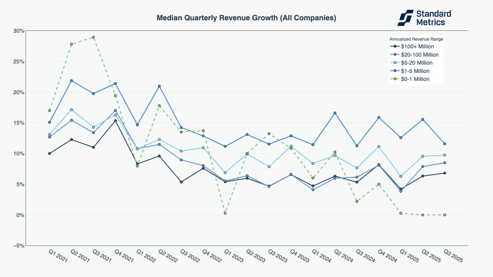 For graphs that represent multiple revenue buckets of companies [e.g. “Median Quarterly Revenue Growth (All Companies)” chart above], our N count is the minimum number of companies across the smallest cohort in the most recent period (e.g. “Q3 2025”). For graphs analyzing a single revenue bucket on one metric, N is the number of companies in the most recent period in the chart. Data points must have at least 30 companies to be shown.
