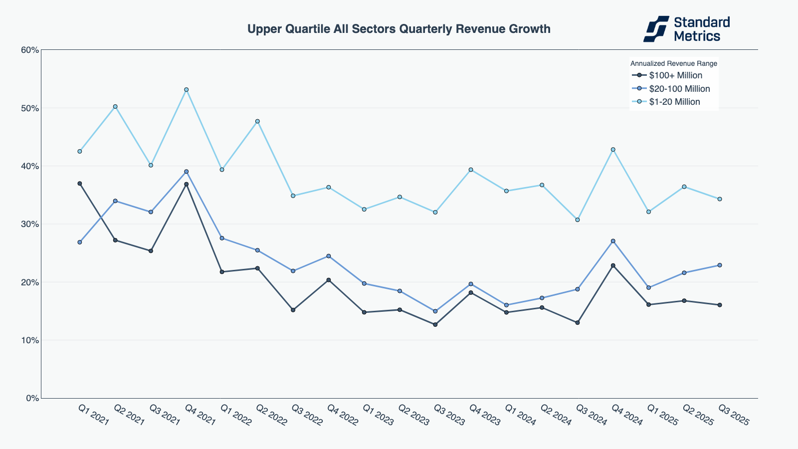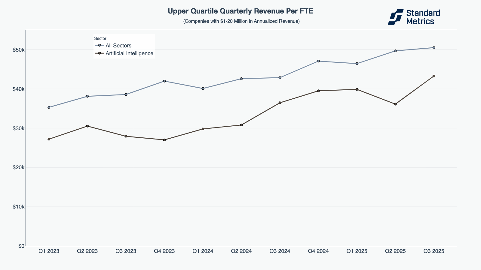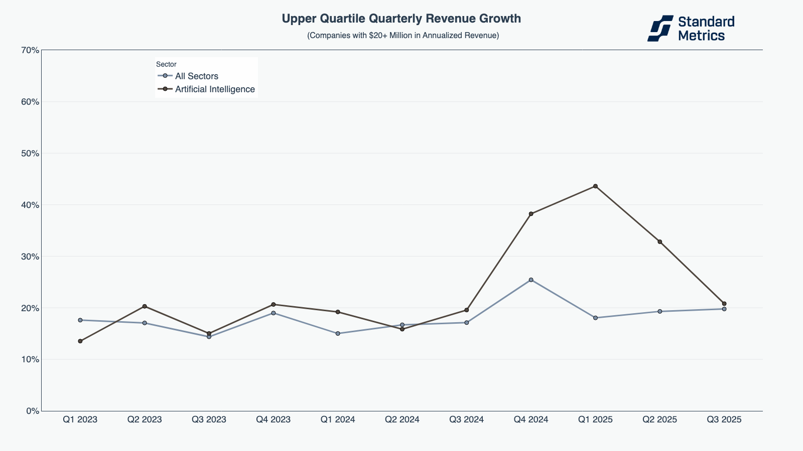 At both the $1-20M and $20M+ revenue ranges, the best AI companies outpaced the “all sector” average. Earlier-stage, upper-quartile AI growers saw improvements in quarterly revenue growth — up 7 percentage points between Q2 and Q3 — and were growing significantly faster than their all-sector peers.