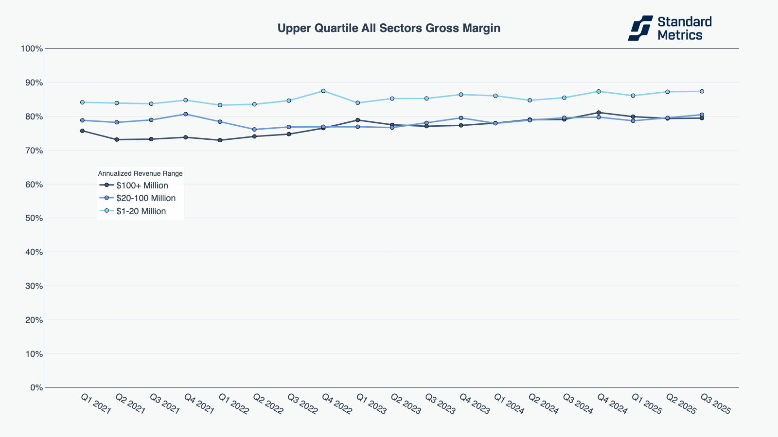 In Q3 2025, fintech continued its steady climb, with companies across all revenue bands improving in both quarterly revenue growth and gross margins, as well as outperforming the broader market.