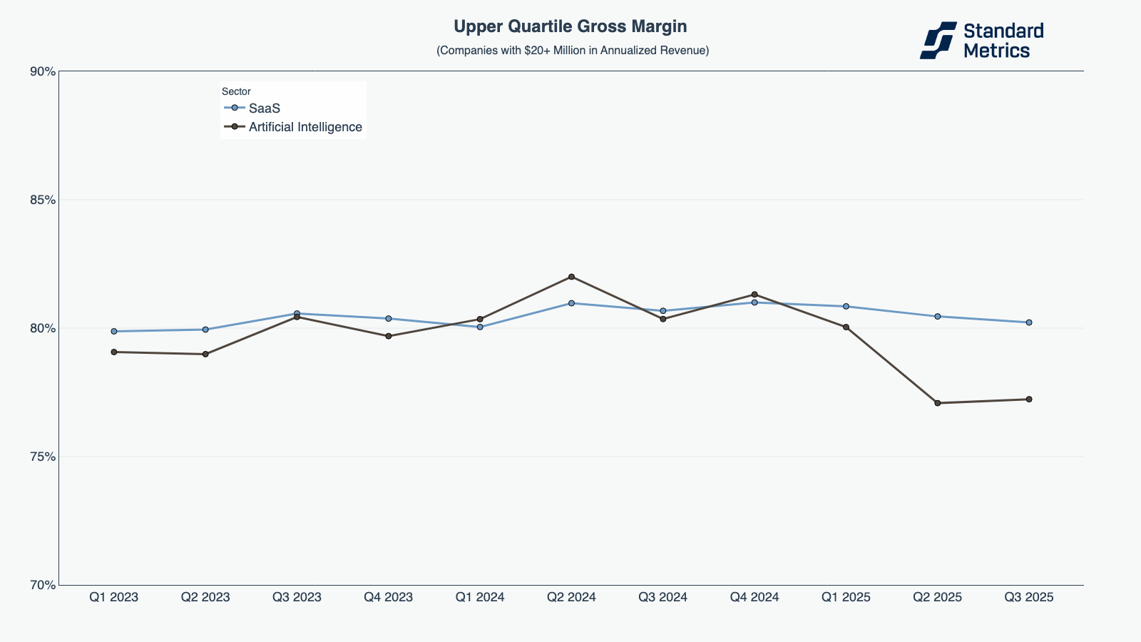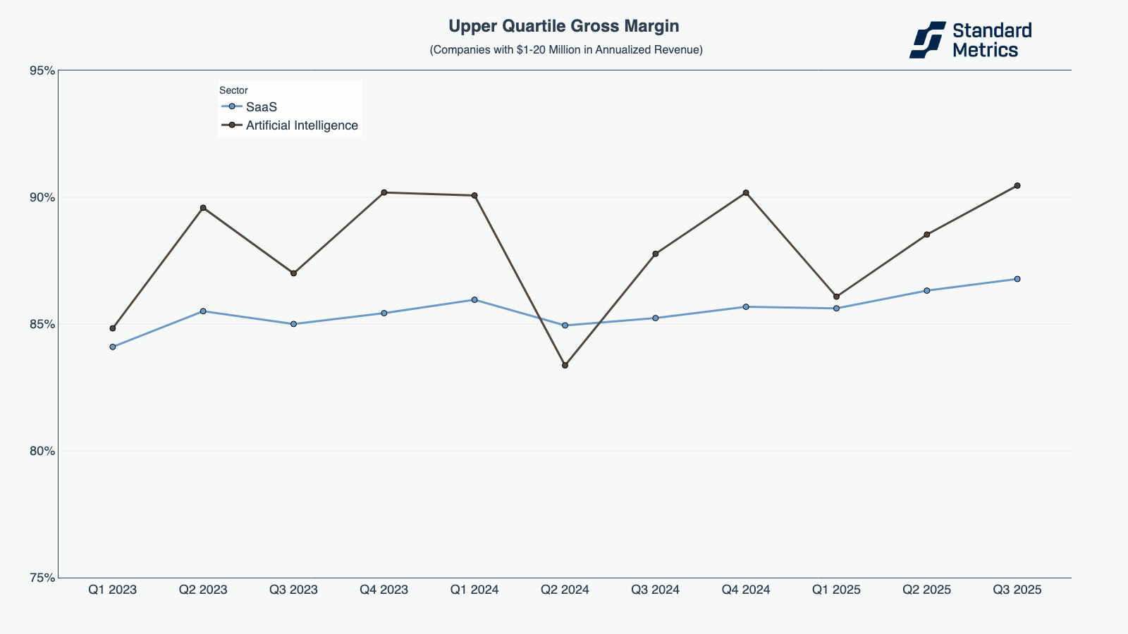 As we did in our Q2 2025 Startup Benchmarking Report, we compared AI to SaaS (instead of all sectors) for our gross margin analysis. Like last quarter, AI companies outperformed SaaS in Q3 2025 in the $1-20M category.