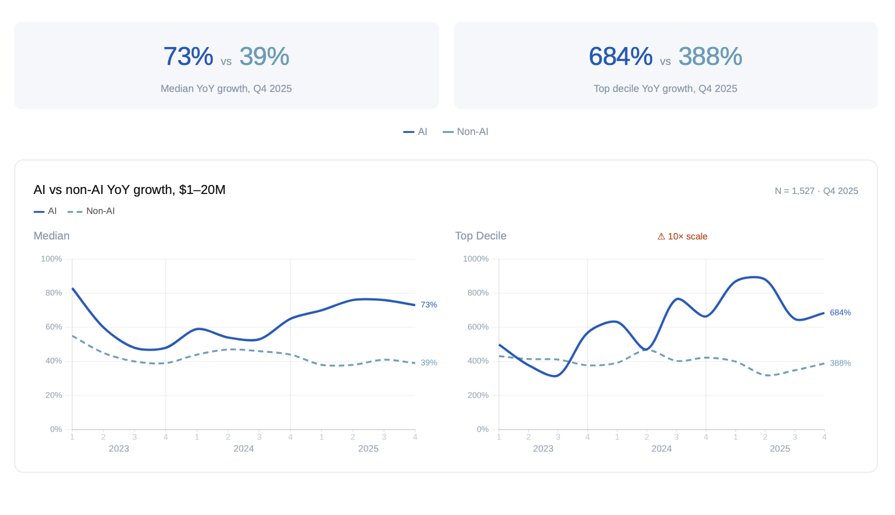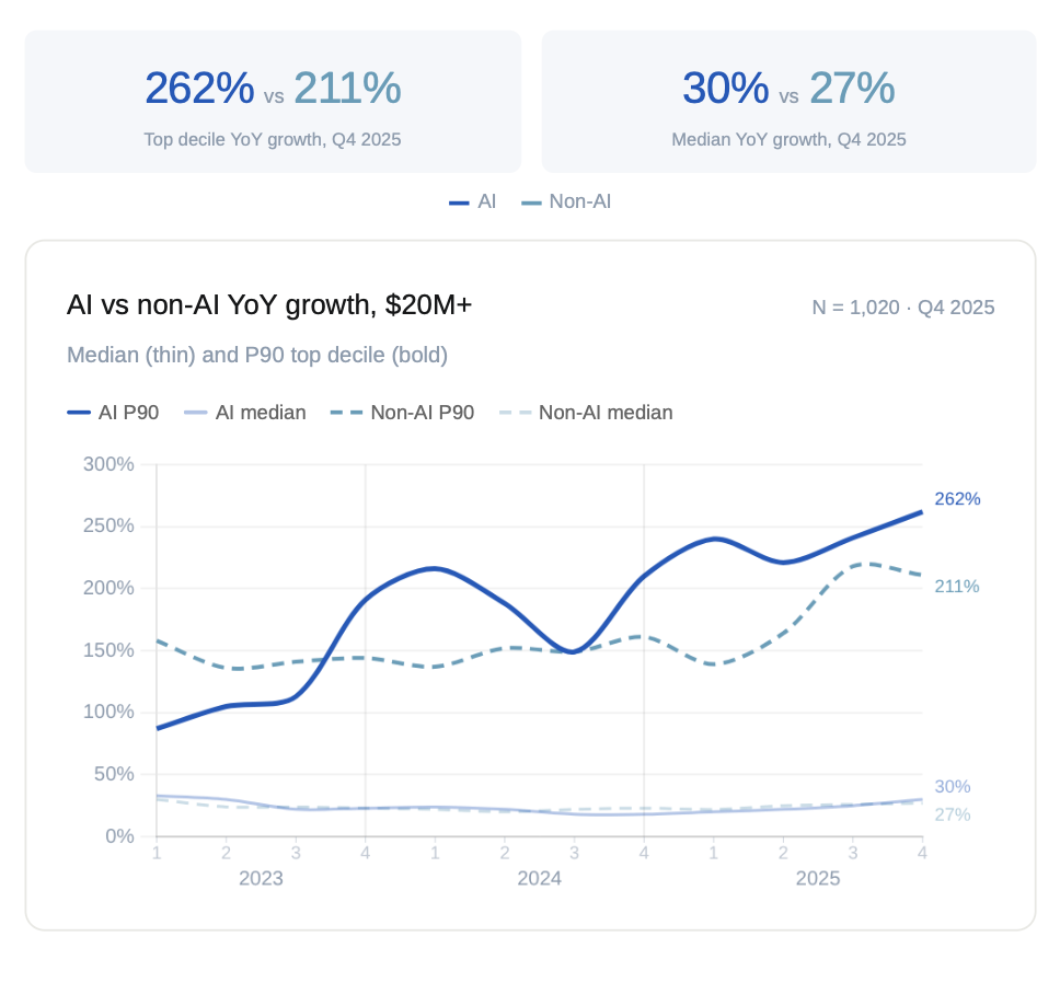 In this report, we examine whether AI companies are truly outperforming their peers and for how long that advantage holds as they scale. We then look at the shape of the market by company size, observing how top decile companies are breaking out and how companies with under $1M in annualized revenue are struggling. Finally we break down S&M and R&D spend, looking at how spend translates into growth. This report is your data-driven guide to understanding what actually drove private market performance in 2025 — and what to keep an eye on going forward.