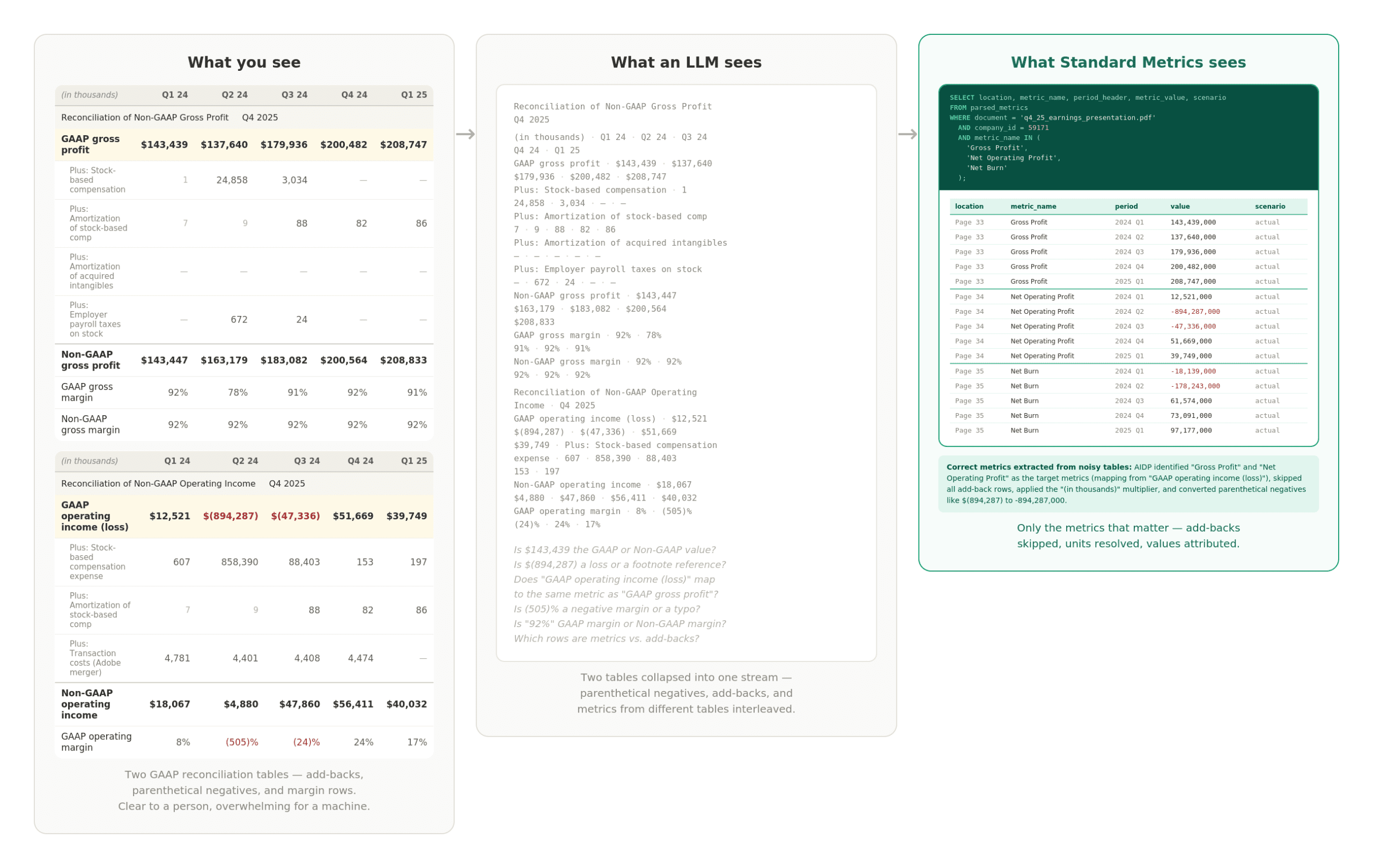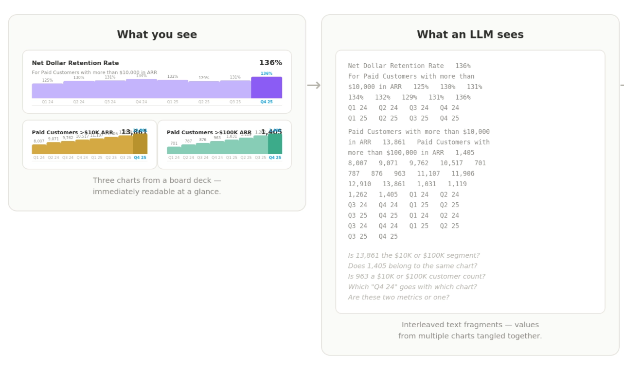 But while board decks and PDFs are easy for people to read, the visual formatting that makes them readable doesn’t translate well into structured data. When we look at a chart, we immediately connect bars, labels, periods, and trends. When we see a table, we understand how the relationships between rows, columns, and headers work.